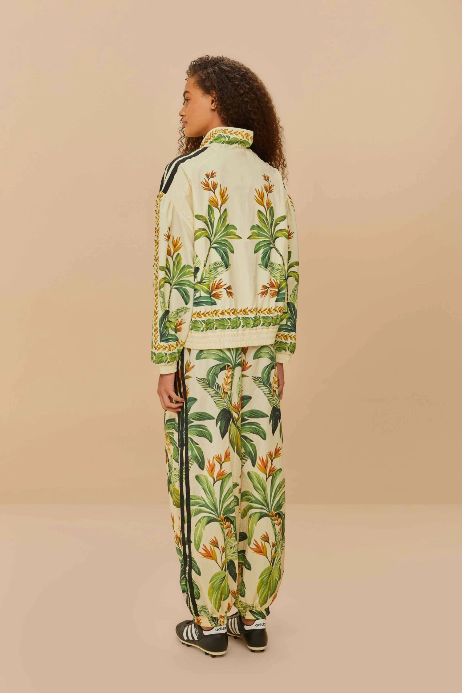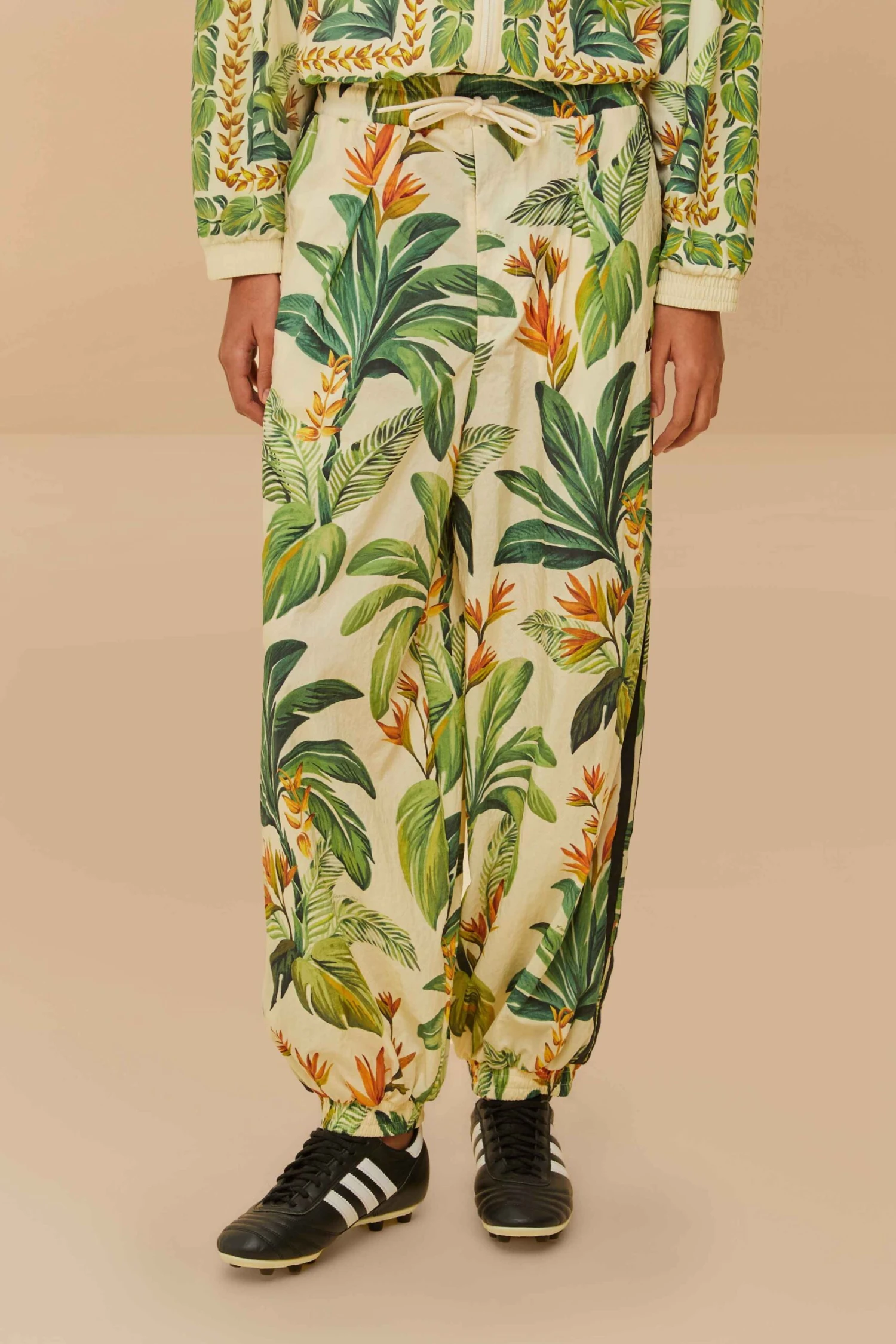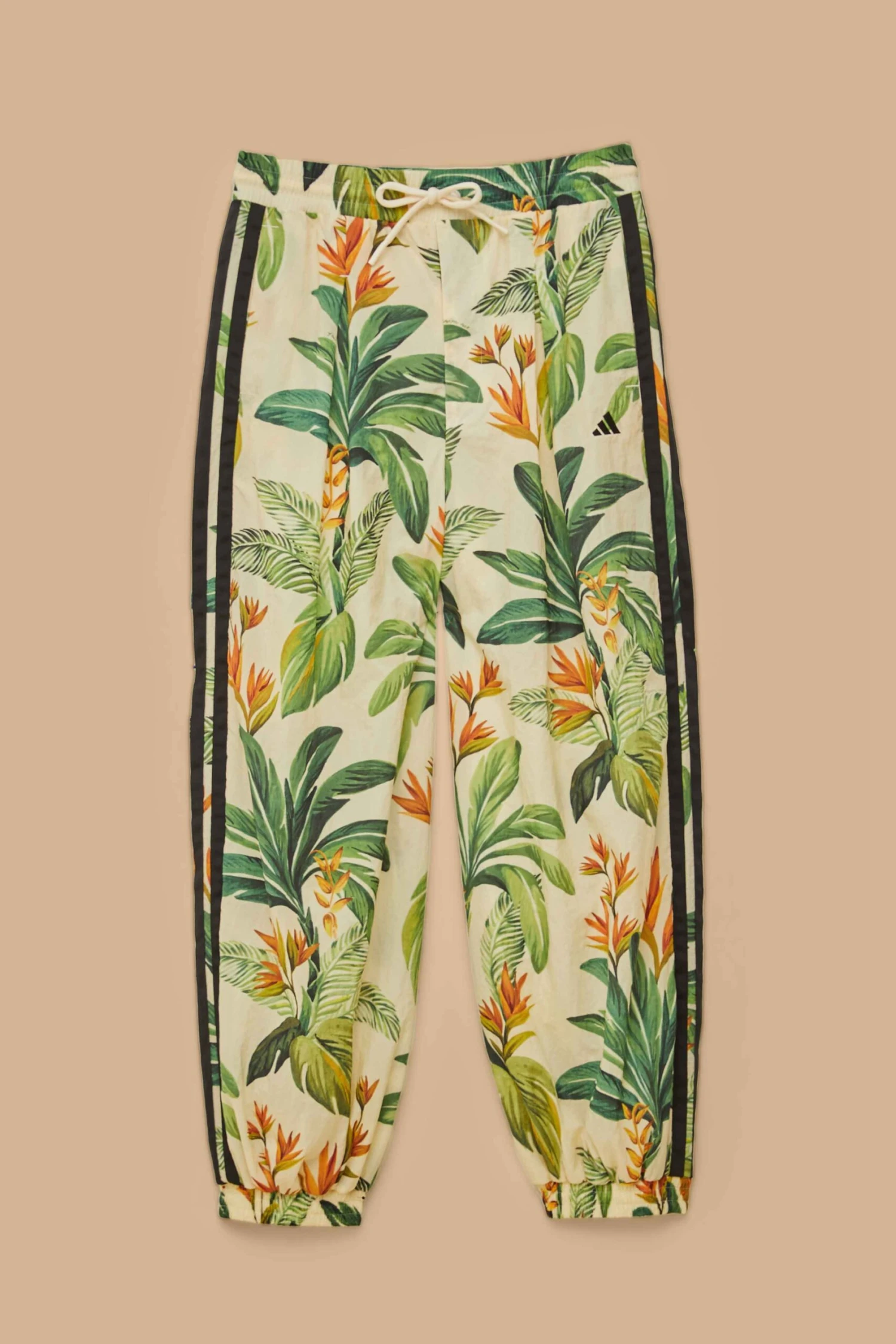 Embrace the essence of tropical flair with the adidas tropical breeze cream white pants. Crafted from responsible materials, these pants feature enchanting embroidery and a lush botanical print bursting with vibrant greens and oranges. The relaxed silhouette and elastic cuff details add an effortless charm, while the signature adidas stripes lend a playful touch, making them a perfect blend of style and comfort for any occasion.