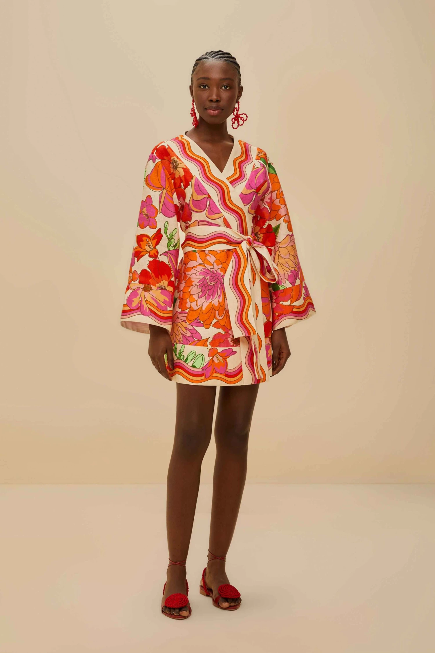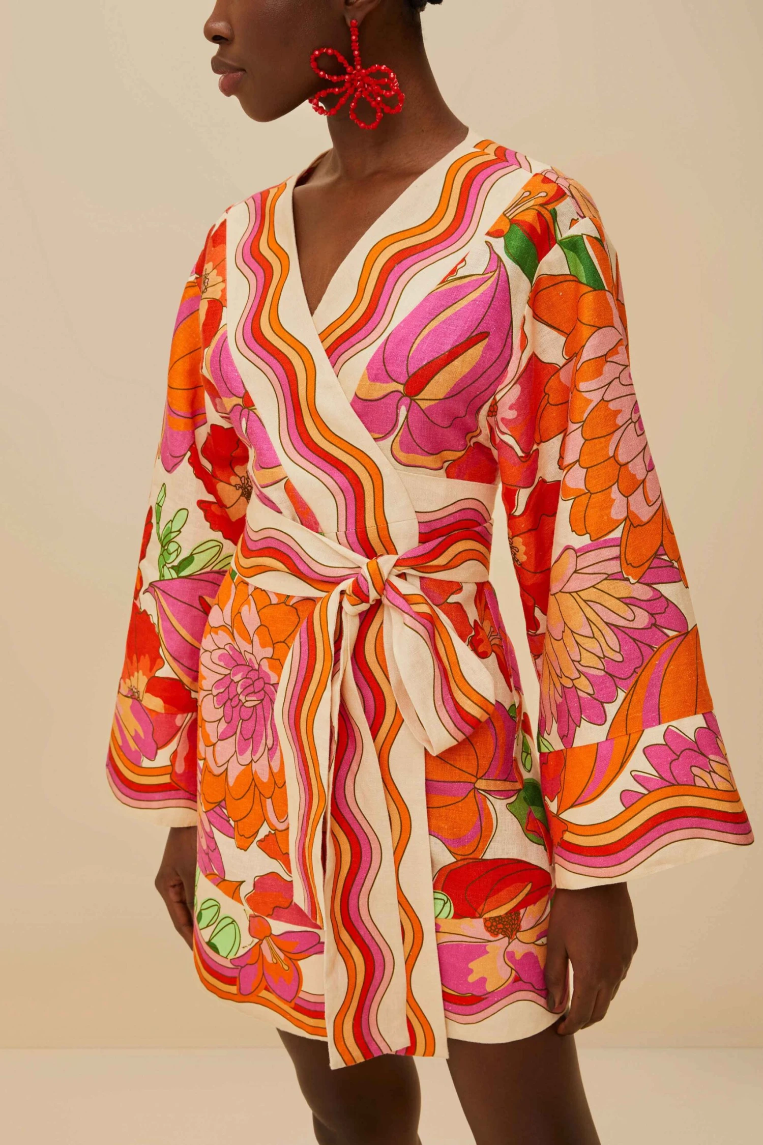 Embrace the vibrant essence of spring with the Beige Spring Affair Euroflax™ Premium Linen Mini Dress. A kaleidoscope of playful florals in radiant oranges, pinks, and whites dances across the soft linen fabric. The dress features a flattering V neckline and charming wide sleeves, gracefully accentuated by a self-tie belt that cinches the waist in a captivating silhouette. Made of responsible materials, this piece captures the warmth and joy of a blossoming garden.