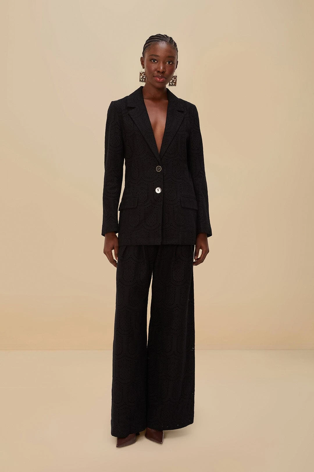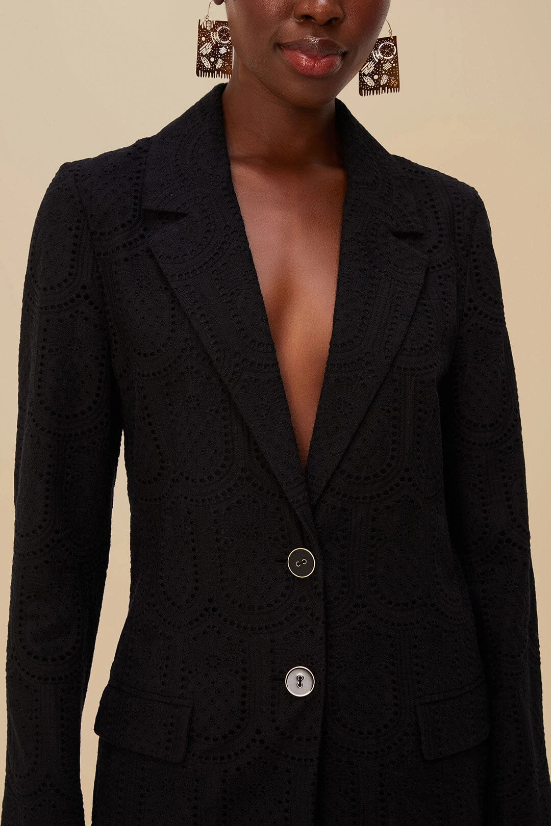 Elevate your ensemble with the black eyelet blazer from FARM Rio, where exquisite craftsmanship meets vibrant flair. This elegant piece features an intricate eyelet pattern, lending a whimsical touch to the classic silhouette. The V neckline adds a hint of allure, perfectly contrasting the blazer’s sophisticated structure. Finished in a deep, timeless black, this blazer effortlessly complements any wardrobe and exudes a playful yet refined charm that is distinctly FARM Rio.