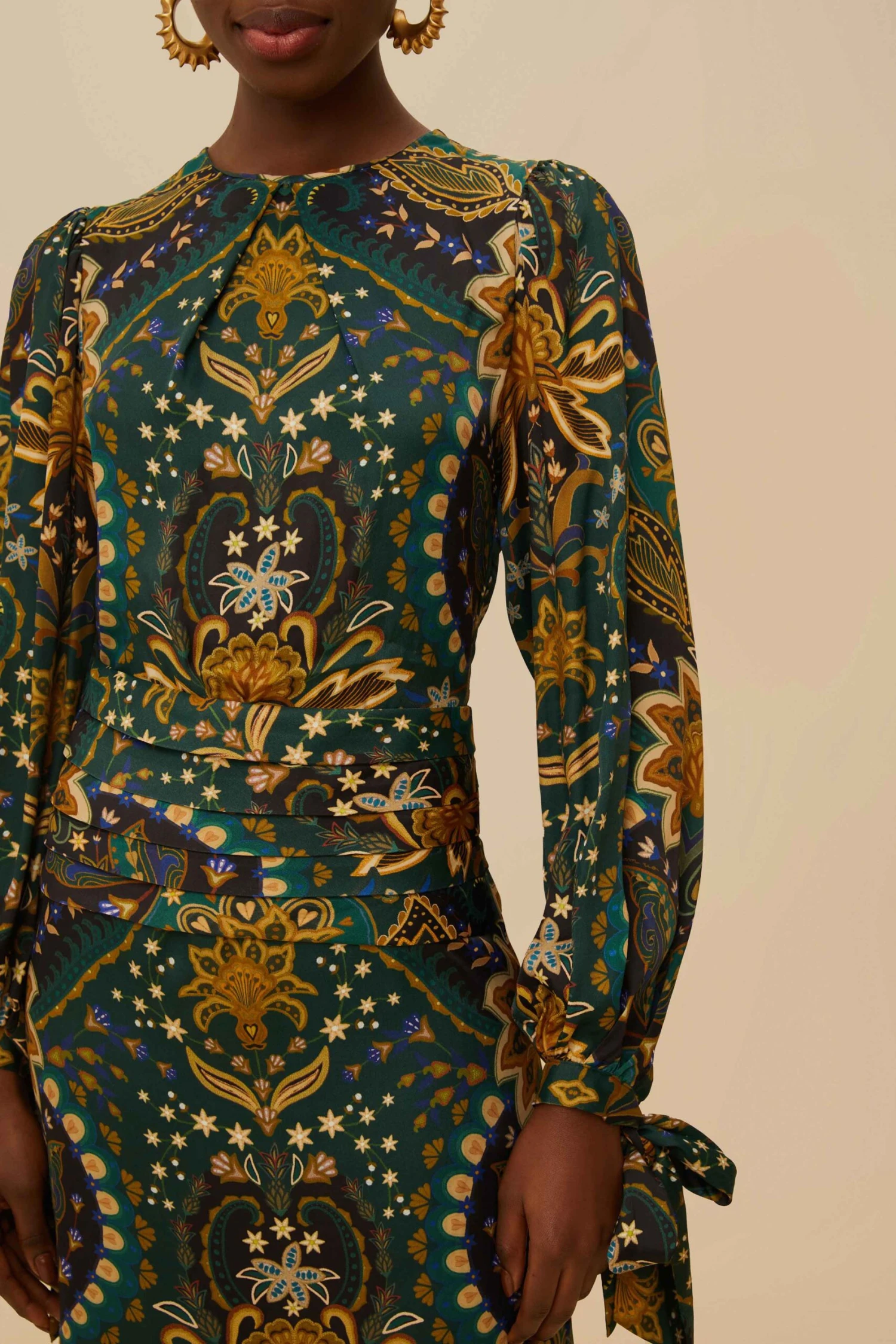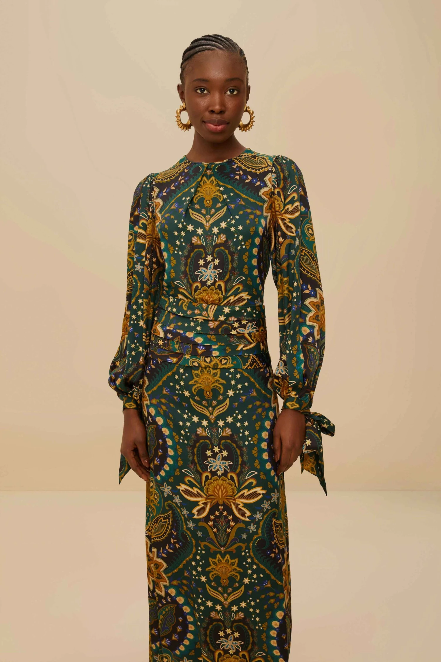 Embrace the enchanting allure of the Black Jaipur LENZING™ ECOVERO™ Viscose Maxi Dress by FARM Rio. Crafted from responsible materials, this maxi dress dazzles with a mesmerizing paisley pattern in deep greens and golds. The high neckline and open back offer a sophisticated contrast, while the balloon sleeves add a playful touch. Perfect for creating unforgettable moments wherever your journey takes you.