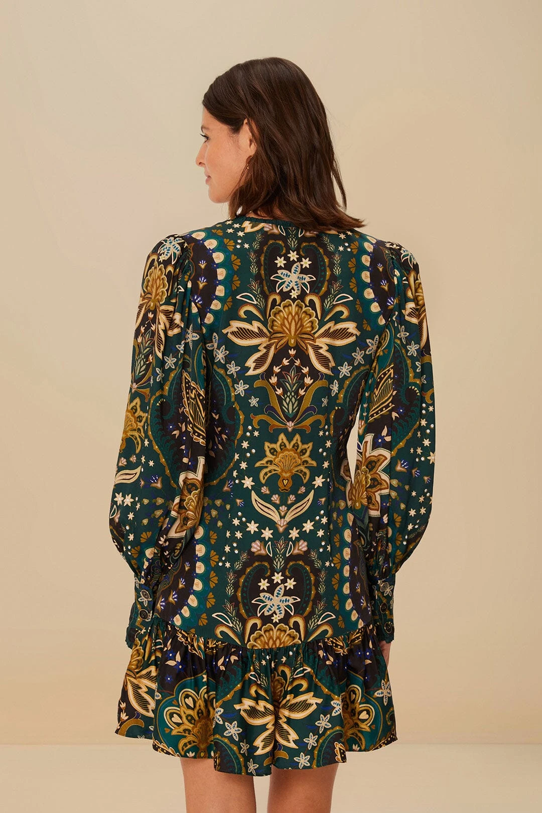 Introducing the black jaipur LENZING™ ECOVERO™ viscose mini dress by FARM Rio—an enchanting blend of elegance and playfulness. This dress features a mesmerizing pattern inspired by Jaipur’s vibrant spirit, with an alluring V neckline that gracefully frames your silhouette. The breezy mini length adds a touch of flirtation, while the dress’s soft, responsible materials ensure a feel-good experience. Revel in the captivating world of FARM Rio with this beautiful piece.
