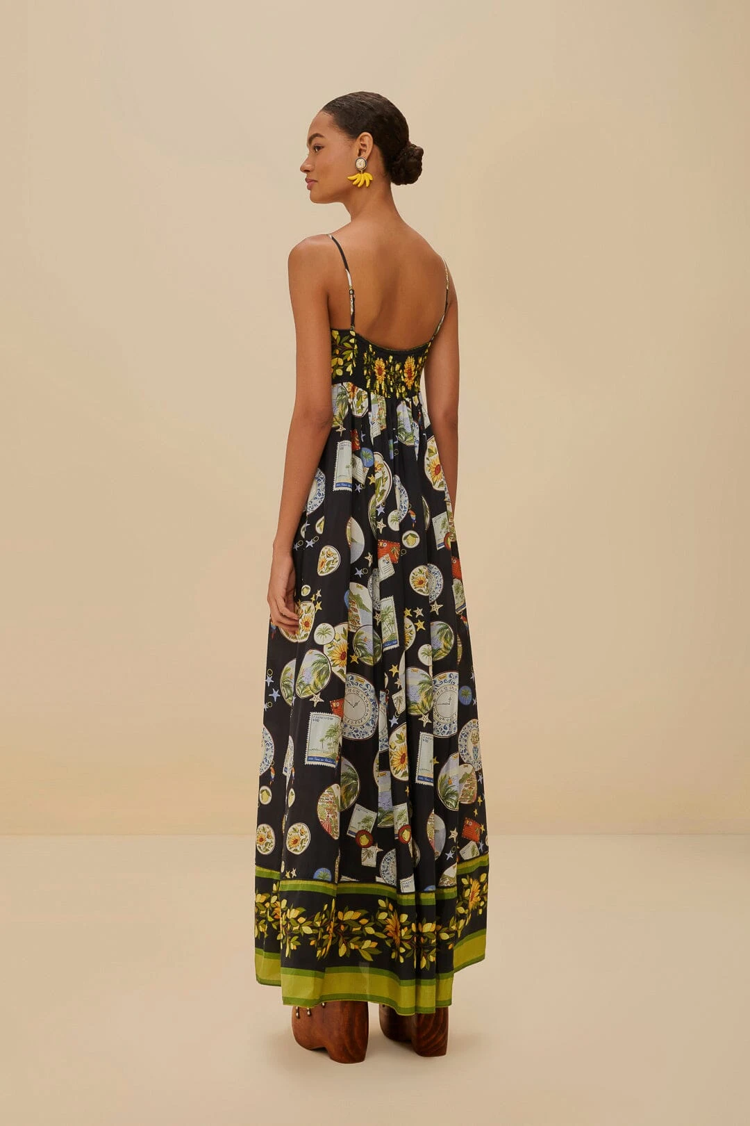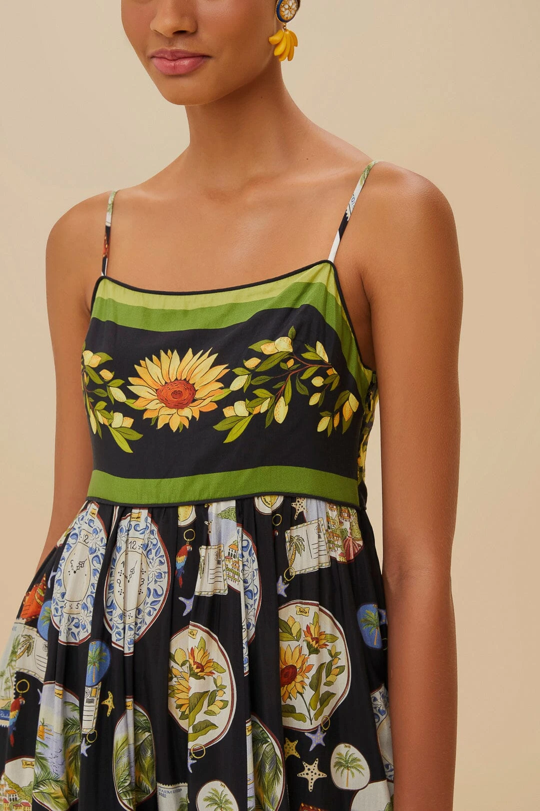 Step into vibrant elegance with the Black Trip Souvenir Maxi Dress by FARM Rio. This enchanting piece showcases a playful mix of colorful, eclectic patterns against a deep black canvas. The gathered silhouette flows gracefully, while the square neckline adds a touch of classic charm. Sunflower motifs and whimsical details evoke a sense of joyful wanderlust, making it a standout piece for any occasion. Embrace the artistry and warmth of this captivating dress.