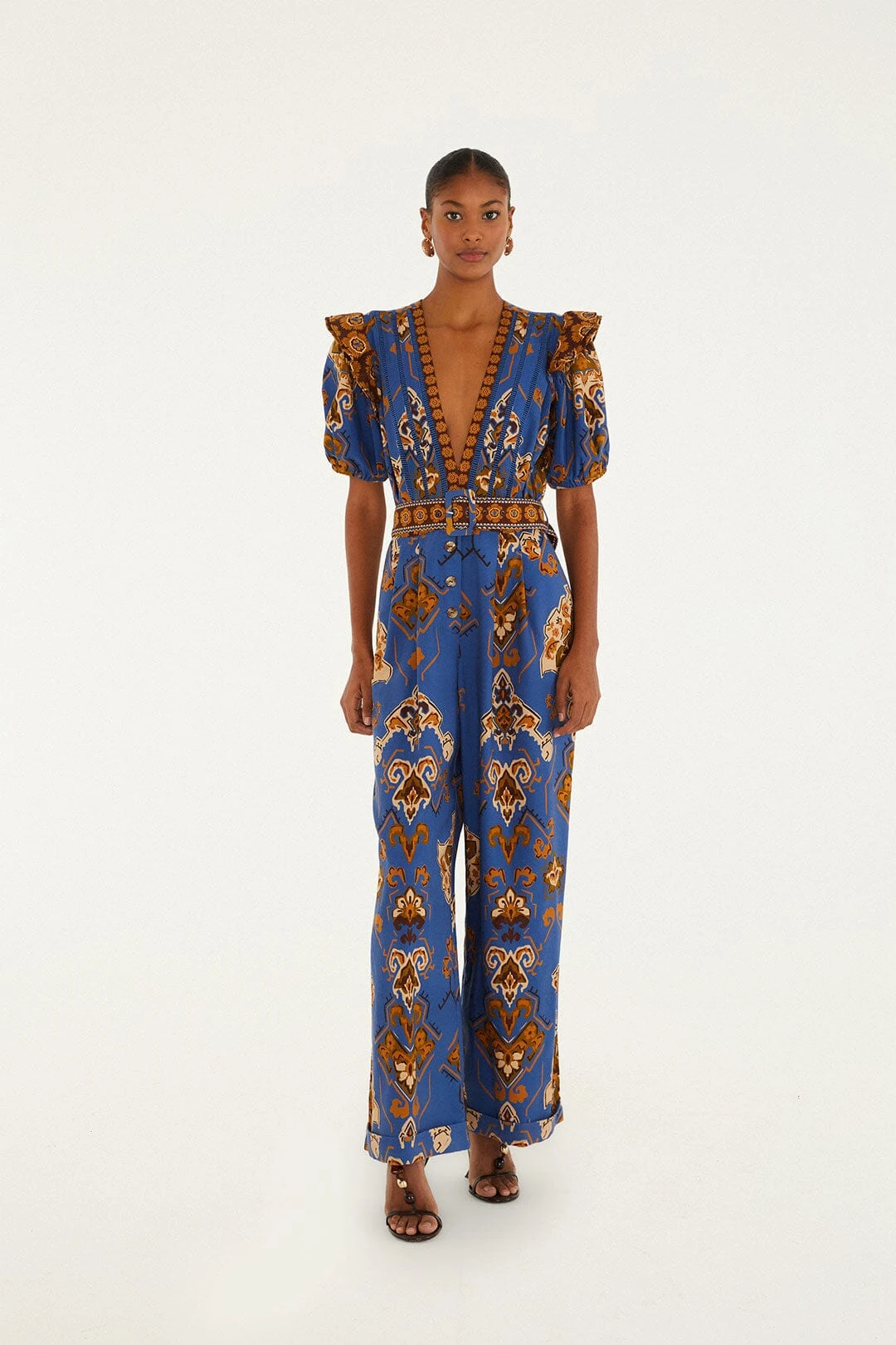 Step into a world of enchantment with the Blue Ornament Floral Jumpsuit from FARM Rio. This stunning piece features a whimsical array of vibrant florals beautifully contrasted against a serene blue backdrop. The V neckline gracefully frames the face, while the relaxed silhouette ensures effortless elegance. Delicate ruffles dance along the sleeves, adding a playful touch to your every move. Perfect for those sunny days when you want to feel uniquely radiant.