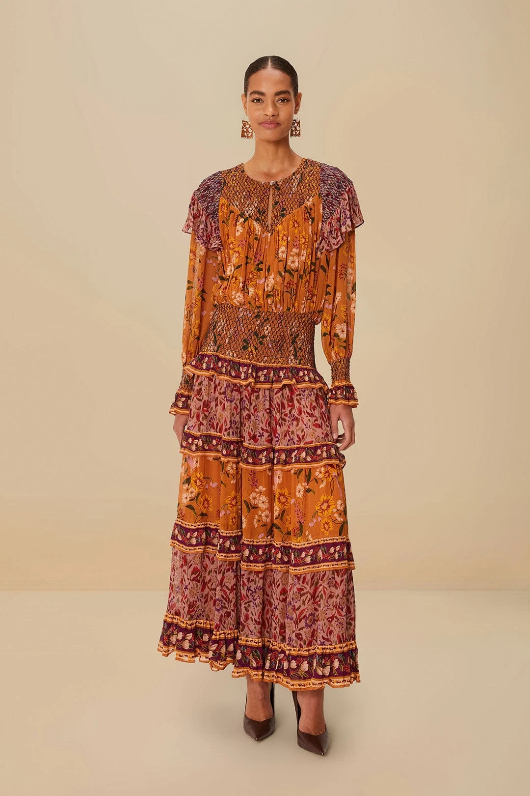 Embrace the vibrant charm of the Colorful Birds Camel Smocking Long Sleeve Maxi Dress. This delightful piece flourishes with lively floral patterns and intricate smocking, creating an aura of effortless grace. The round neckline complements the flowy silhouette, while layered ruffles add a playful touch. Warm camel hues intermingle with bursts of color, making it the perfect embodiment of tropical elegance and joie de vivre.