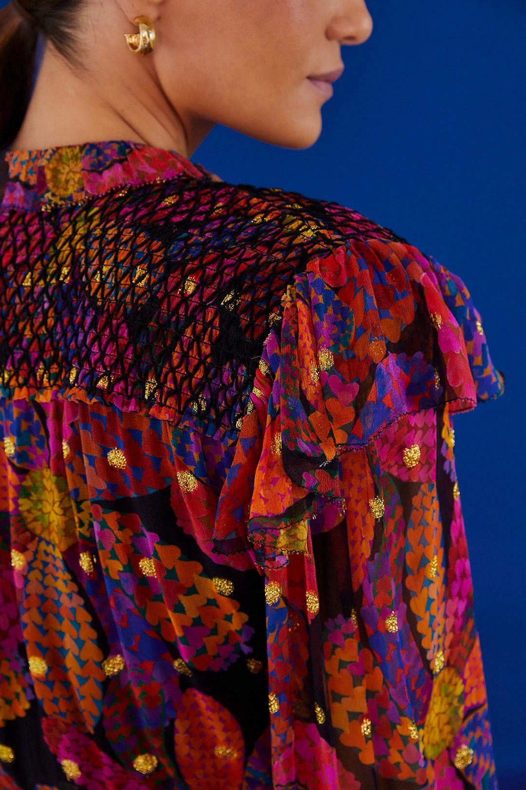 A nature-inspired vibe to brighten your wardrobe up. The Black Heart Daisy Mini Dress comes to embrace you without losing comfort. It has a cozy silhouette with smocked parts and ruffles alongside this eye-popping print, which takes this dress to the top of your must-have list. So bring your bold FARM Rio Shoes to this cute mood and feel lovely from head to toe!