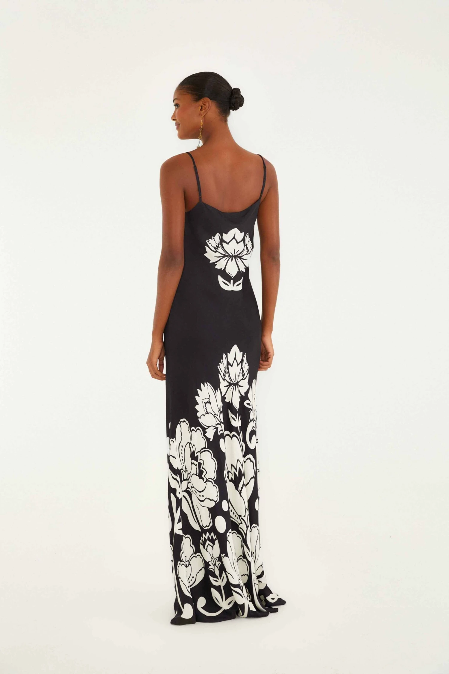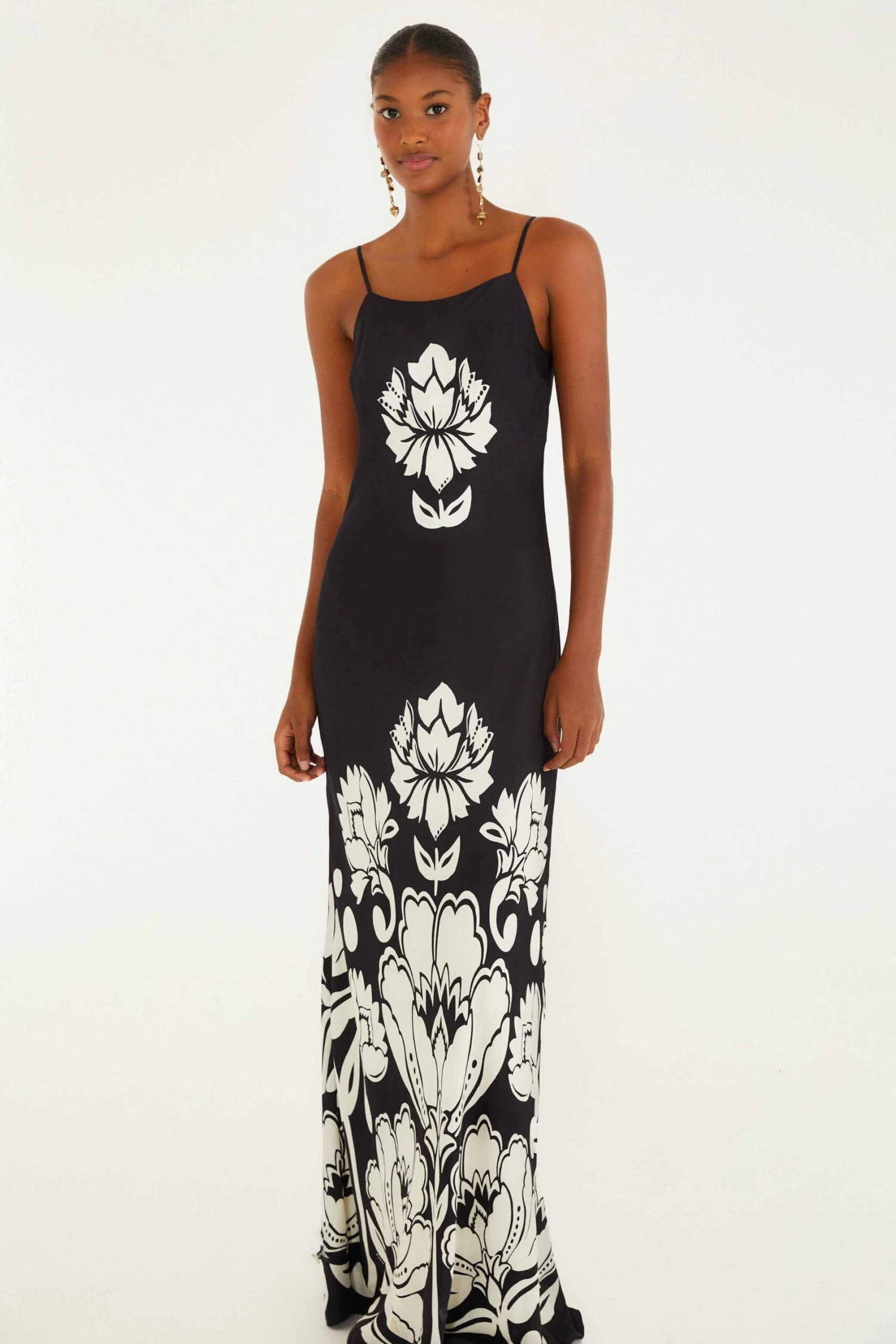 Embrace effortless elegance with this Black & White Floral Arabesque Maxi Dress, crafted from eco-friendly Lenzing Ecovero Viscose. Its sleek slip silhouette gently skims the body, enhanced by a graceful square neckline and delicate spaghetti straps. Bold, oversized floral patterns in striking black and white create a captivating contrast, evoking a playful yet refined spirit. This dress flows with ease, perfect for those who cherish comfort wrapped in Brazilian charm.