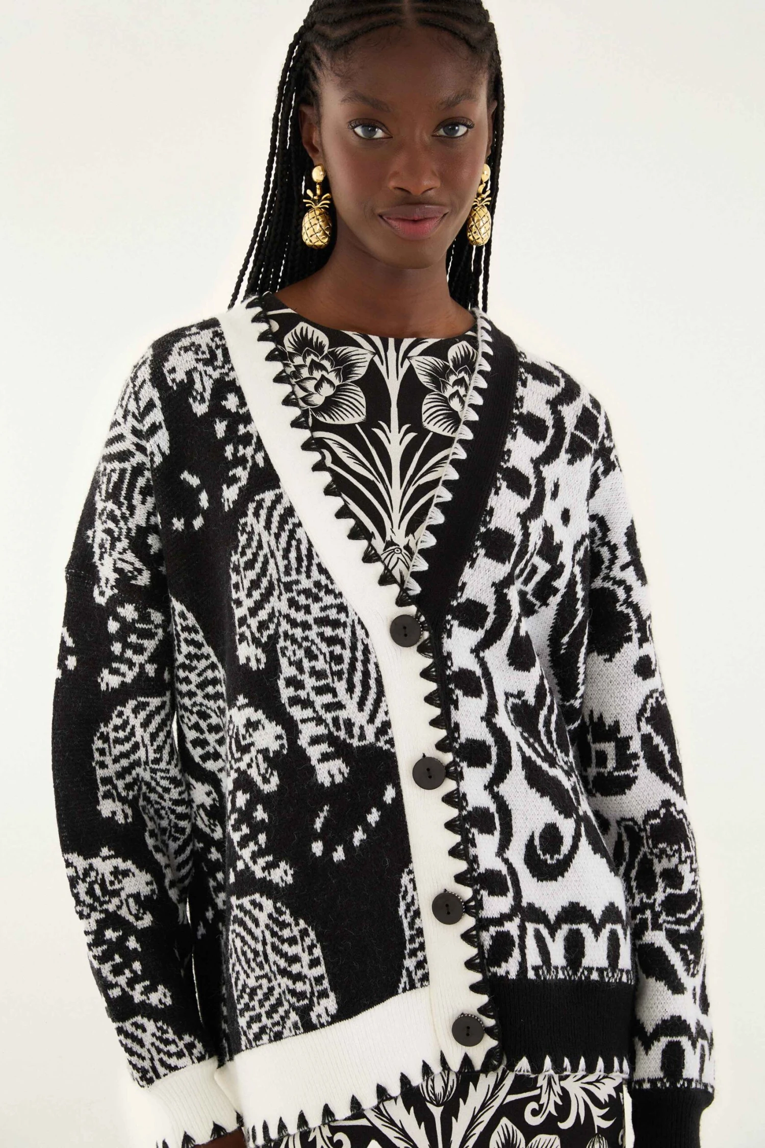 Embrace bold contrasts in this Black & White Mixed Striped Tigers Buttoned Knit Cardigan from FARM Rio. The playful patchwork of tiger motifs and abstract patterns creates a striking visual rhythm, while the cozy knit invites warmth and softness. Featuring a flattering V neckline edged with delicate scalloped trim, this cardigan blends casual ease with artistic flair, transforming everyday knitwear into an expressive, spirited staple.