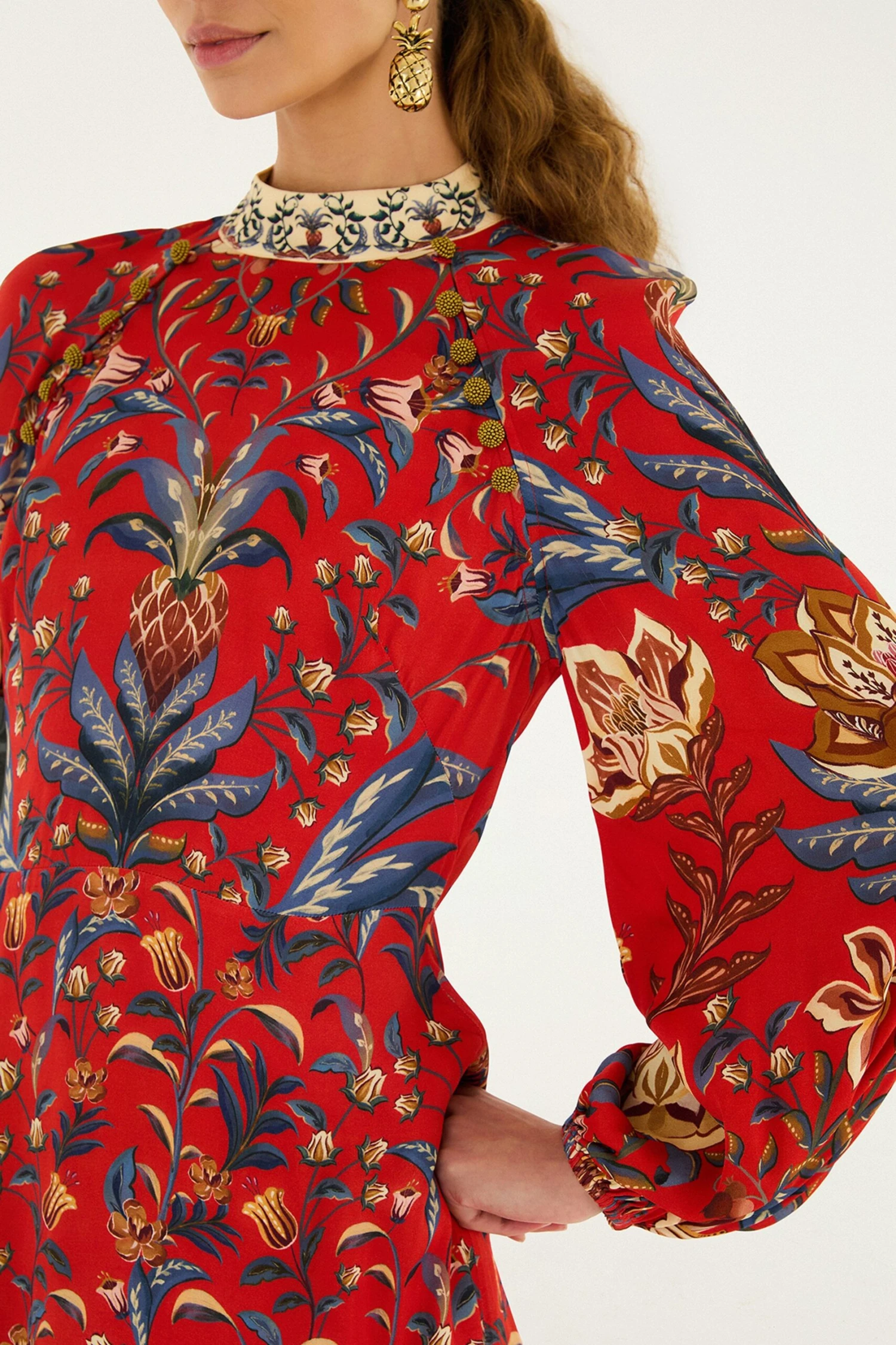 Embrace the rich tapestry of red and warm earth tones in this Red Winter Breeze mini dress, where bold botanical motifs bloom across fluid Lenzing Ecovero viscose. The high neckline cradles your silhouette, while the voluminous balloon sleeves add a touch of playful elegance. A delicate contrast pleated hem sashays gently with every step, making each moment feel like a soft breeze wrapped in responsible luxury.