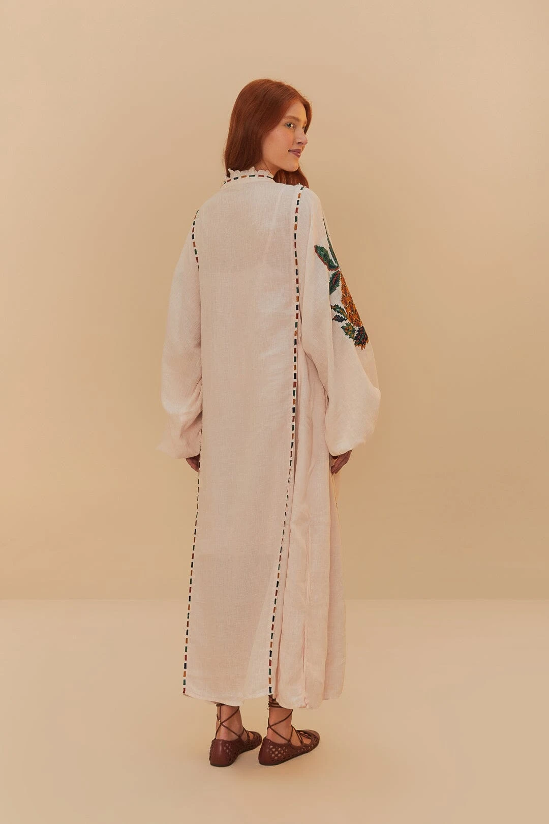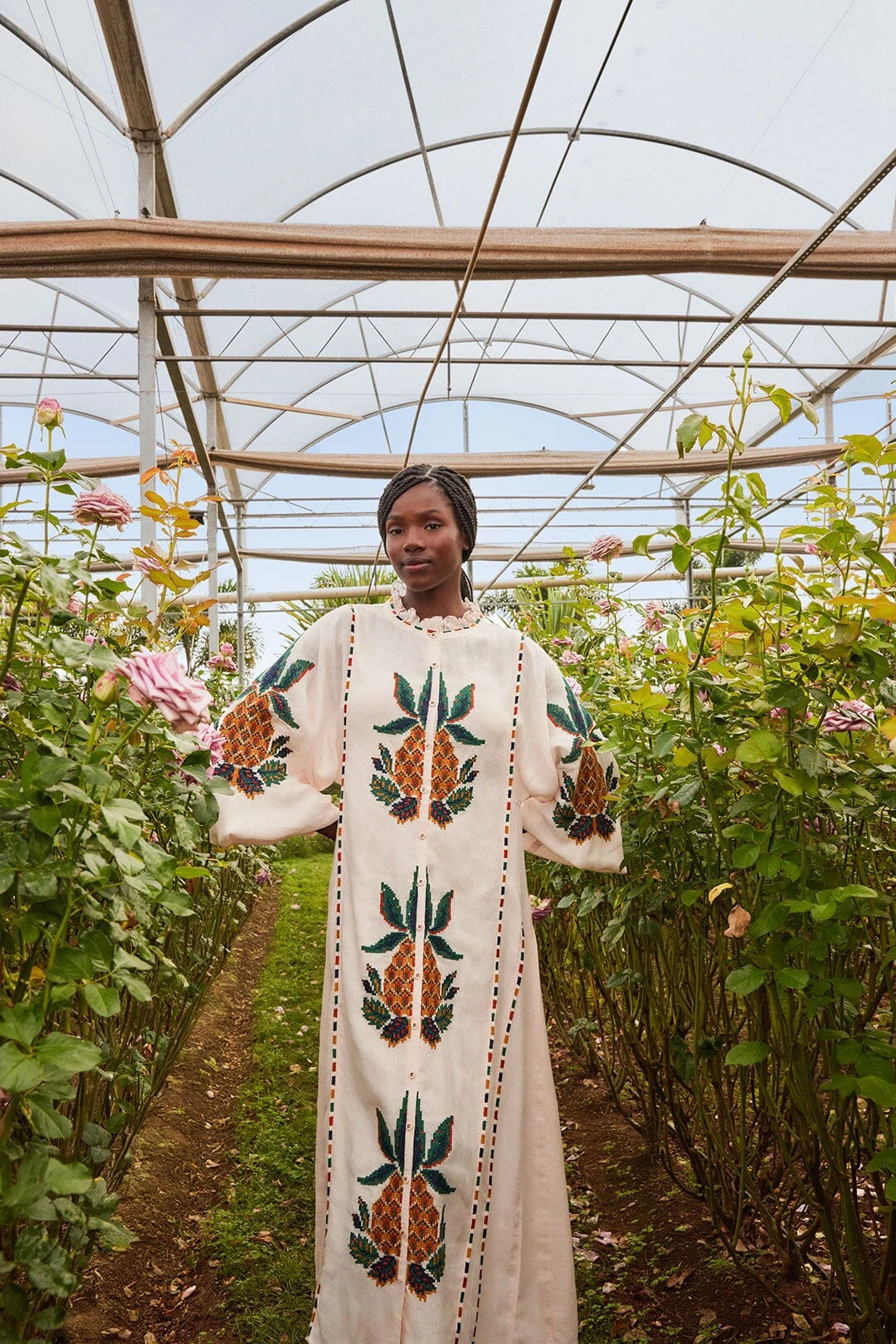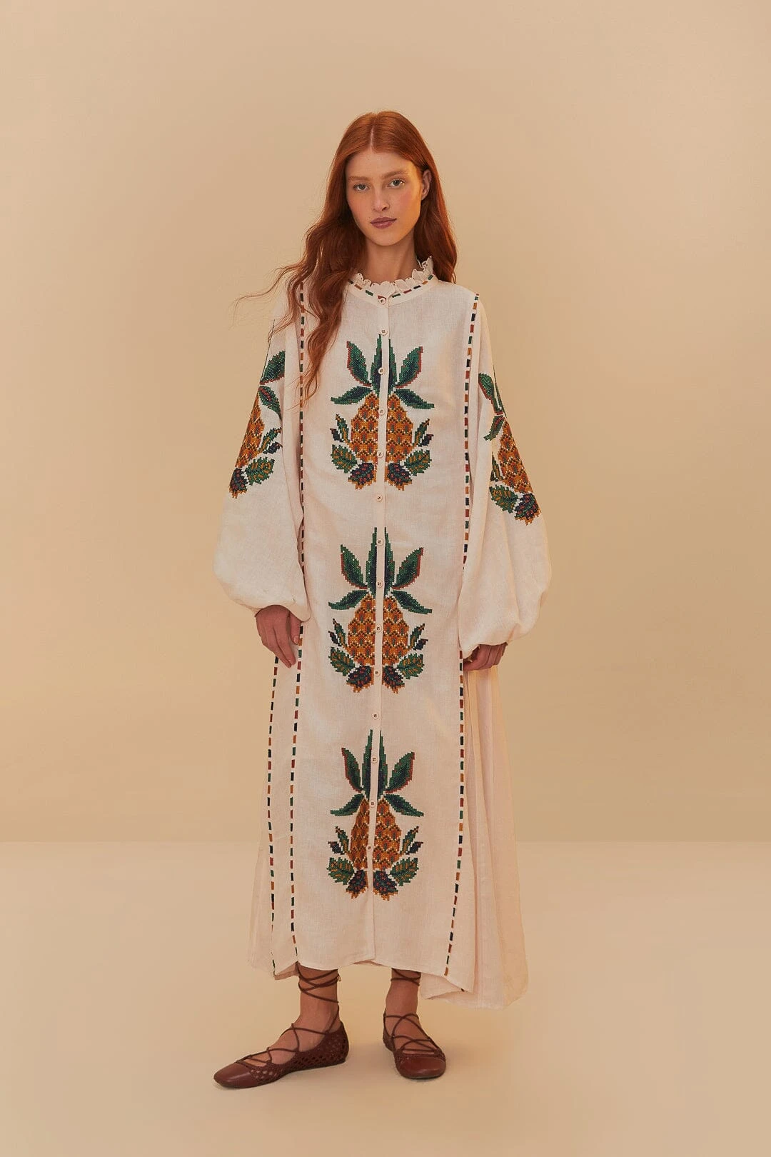 The Light Pink Cross Stitch Pineapple Embroidered Midi Dress is a charming blend of playfulness and elegance. Adorned with intricate pineapple embroidery, its high neckline creates a graceful silhouette, while voluminous sleeves add whimsical flair. The delicate cross-stitch detailing and soft pink hue evoke a sense of warmth and sophistication, making it the perfect choice for those who appreciate unique and artful fashion statements.