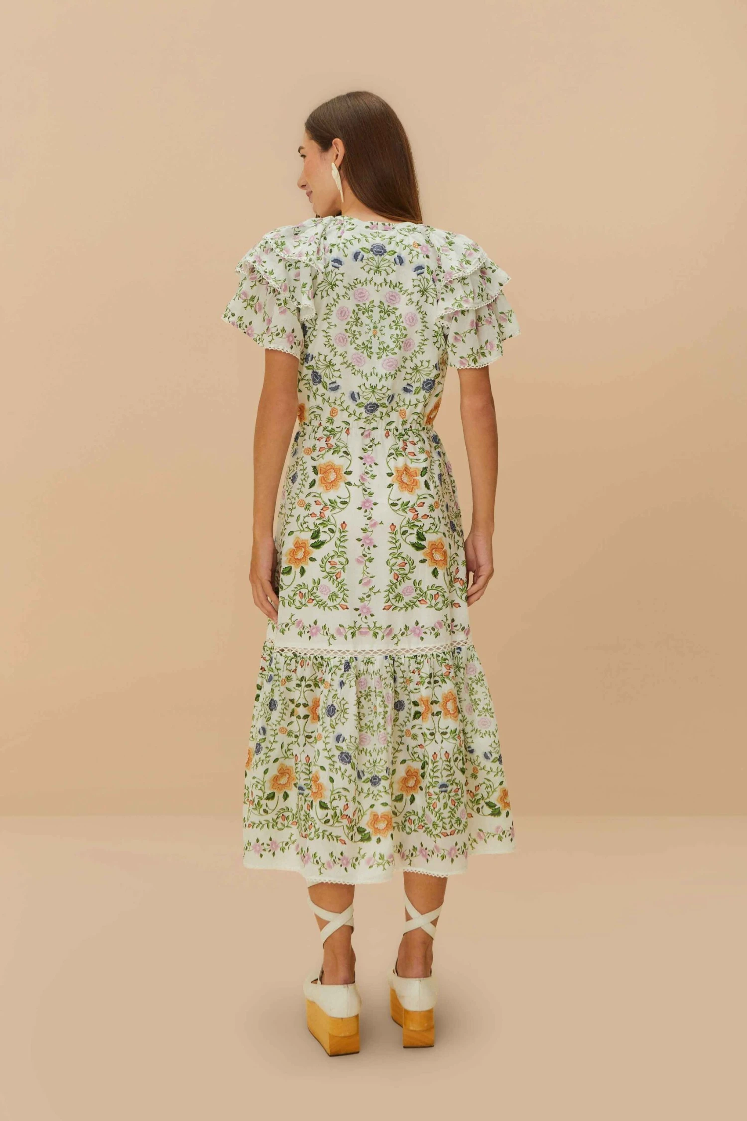 Embrace a blend of folk artistry with the off-white folk floral lace midi dress by FARM Rio. This piece enchants with its high neckline and intricate floral patterns that dance on a canvas of delicate lace. Playful ruffled sleeves add a touch of whimsy, while the midi length offers effortless elegance. Perfect for those who love to express their unique style with grace and color.