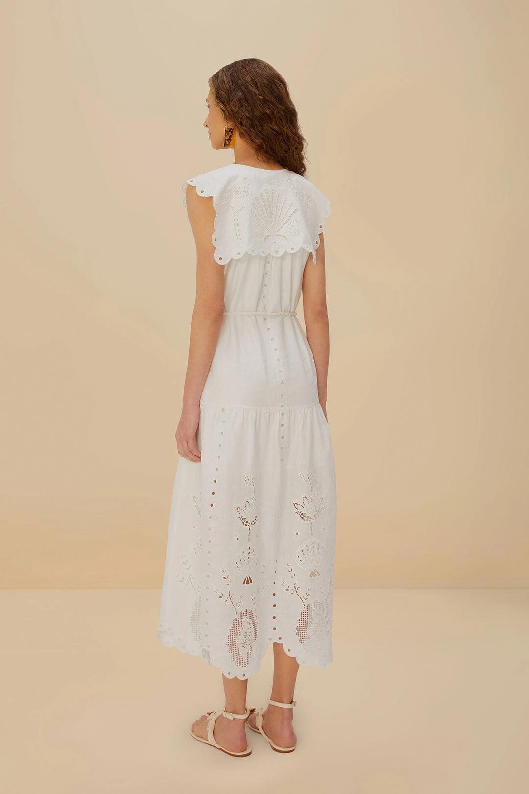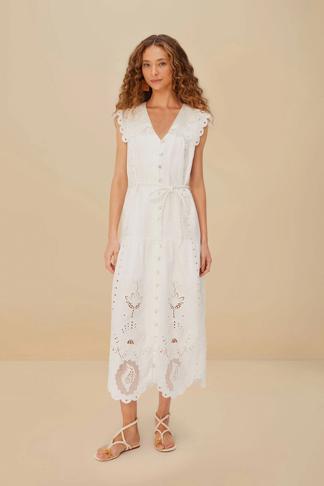 Embrace effortless elegance with the off-white sleeveless euroflax™ premium linen maxi dress. Crafted from responsible materials, this dress features a charming V neckline complemented by delicate eyelet embroidery that whispers romance. The scalloped edges and playful floral patterns dance across the fabric, while the tie waist offers a flattering silhouette. A versatile piece perfect for sunlit strolls or intimate gatherings, bringing a touch of FARM Rio’s warmth to your wardrobe.