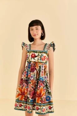 Embrace the vibrant spirit of FARM Rio with the Sand Aura Floral Mini Dress. This enchanting piece features a mesmerizing blend of tropical florals in warm, earthy tones, set against a soft, flowing silhouette. The high neckline adds a touch of elegance, while gentle ruffles cascade down the dress, crafting a dance of playful sophistication. Perfect for sun-drenched days, this dress beautifully captures the essence of effortless charm.